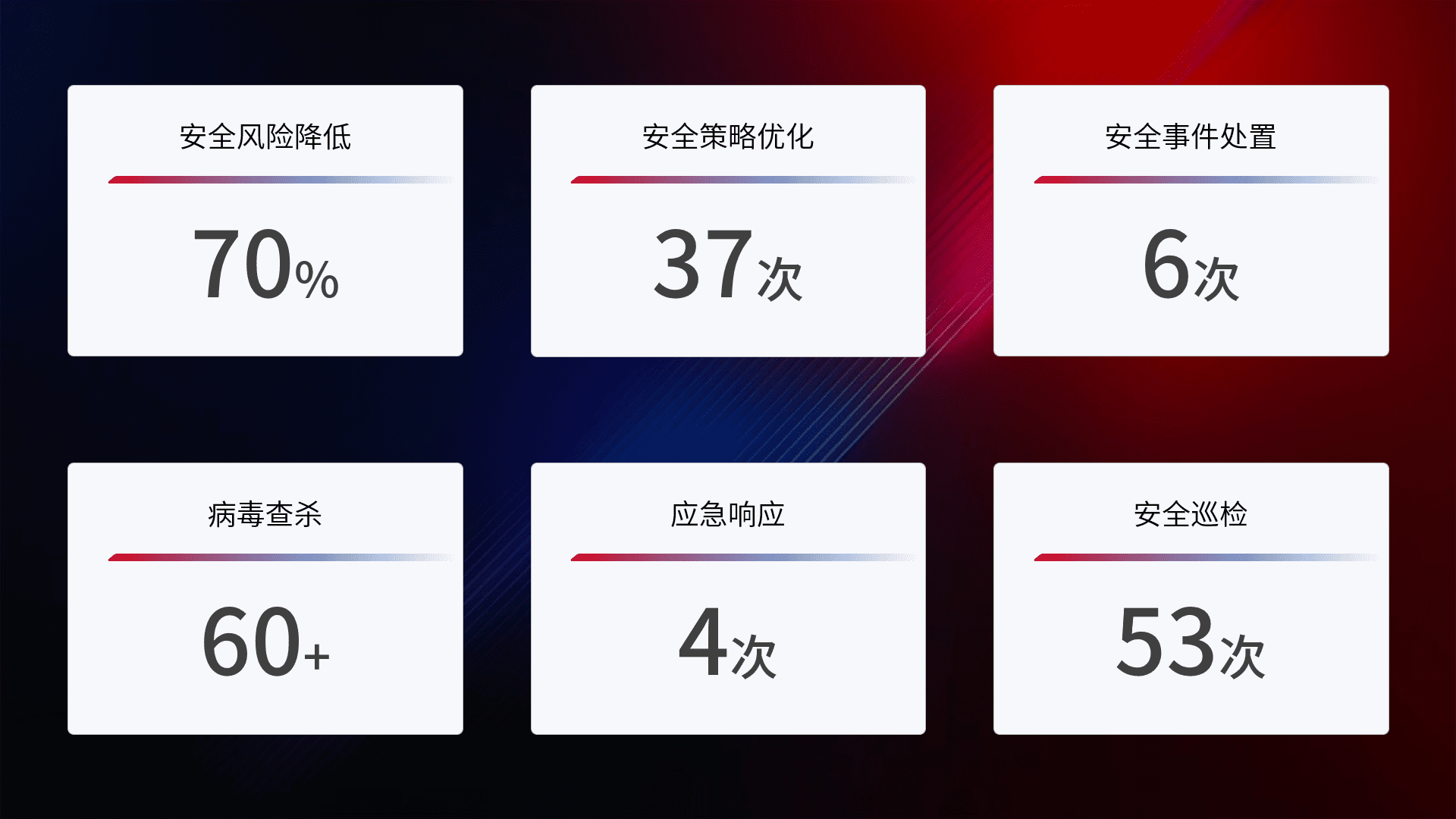 提供全面的安全事件报告体系,,包括处置报告、、、周报、、、、季度和年度总结,,,,结合持续监控,,,,帮助客户深入了解网络安全状况。。。。
